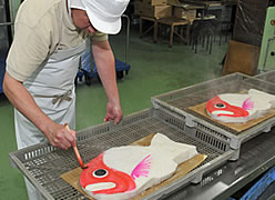 かまぼこの土台にケーキのように搾り出しで絵を描いていきます。線の太さや形によってたくさんの種類の口金を使い分けます。手の体温によって搾り出しの中のすり身が煮えてしまうので手早い作業が要求されます。