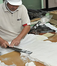 職人が手作業で型抜きをしながら成型されていきます。すり身の中に空気を入れないように練るのと、きれいな渦巻き模様に巻くのが大きなポイントです。